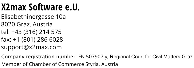The materials appearing on the X2max Software website could include technical or typographical errors. X2max Software does not warrant that any of the materials on its website are accurate, complete, or current. X2max Software may make changes to the materials contained on its website at any time without notice. X2max Software does not, however, make any commitment to update the materials. Some of the web pages contain links to websites not maintained by X2max Software. These links are provided as a convenience to you, and the inclusion of any link does not imply any association or relationship between X2max Software and the linked site. Nor does inclusion of any link imply endorsement, approval, or sponsorship of the linked site by X2max Software, or vice versa. If you use any of these links, you will leave X2max Software's website. The linked sites are not under the control of X2max Software, and X2max Software is not responsible for the contents of any linked site or any link contained in a linked site.